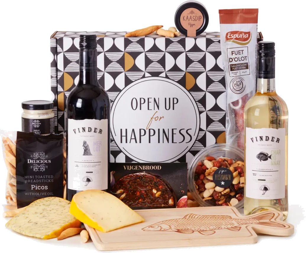 Maak de ervaring compleet met een notenmix 'Sporthaver', een zoete kaasdip met vijgen, en heerlijk vijgenbrood. Alles is verpakt in een stijlvolle cadeaubox 'Open Up For Happiness' die zeker een glimlach op het gezicht van de ontvanger zal toveren.