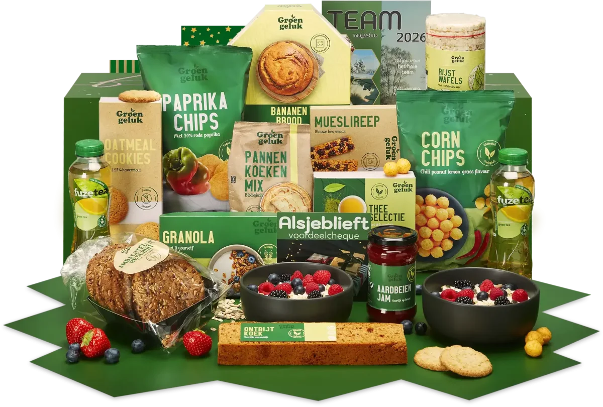 In dit kerstpakket vindt u een selectie van biologische producten die stuk voor stuk met zorg zijn gekozen. Proef de heerlijke Groen Geluk Granola Roast it Yourself, perfect voor een gezond ontbijt. Combineer dit met de Groen Geluk Ambachtelijk beschuit en Groen Geluk Rijstwafels voor een knapperige bite.
