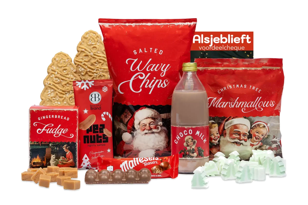 Geniet van de zachte zoetheid van marshmallows en de knapperige textuur van een koek suiker kerstboom. Voor de liefhebbers van hartige snacks zijn er chips en geurige pinda's. Zoetekauwen kunnen hun hart ophalen met romige fudge en een Maltesers reep. Vergeet niet de chocomelk om op te warmen tijdens koude winteravonden.
