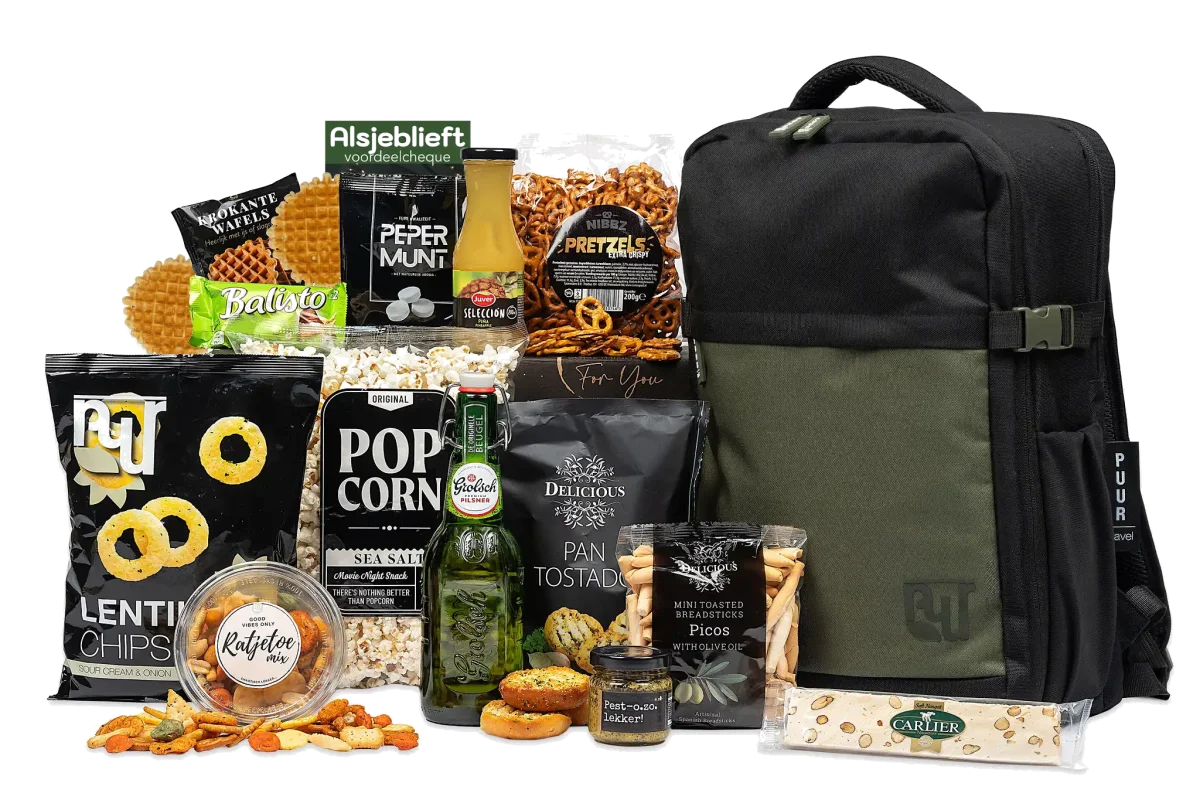 Het pakket bevat een scala aan heerlijke snacks en dranken. Geniet van een verfrissende Grolsch beugel fles bier van 0,45 l, of trakteer uzelf op een zoete nougat reep van 100 gr. Voor de snackliefhebber zijn er mix pretzels en chips inbegrepen.