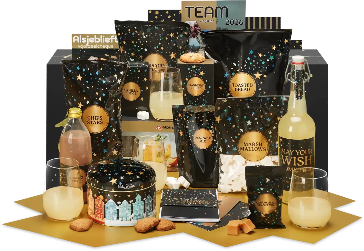 Maak de feestvreugde compleet met de smaakvolle Pindamix Karamel Assorti, Popcorn Karamel en de verfrissende Sparkling Limonade Citroen. Als extra traktatie bevat het pakket Ster Chips, een GRATIS Team Magazine, een GRATIS CenterParcs cadeaubon en een GRATIS Kanjerlot Postcode Loterij Lot. Alles is verpakt in een feestelijke kerstdoos.