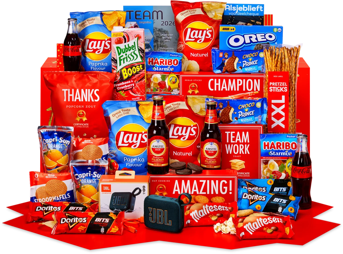 Dit kerstpakket biedt een uitgebreide selectie van lekkernijen. Geniet van Amazing Haverkoekjes, knapperige Champion Broodstengels, en de altijd populaire No. 1 Pretzels. Voor de zoetekauwen zijn er Oreo Filled Cookies en Maltesers. De dorst wordt gelest met Capri-Sun, Coca Cola Zero, en Dubbelfrisss Boost.