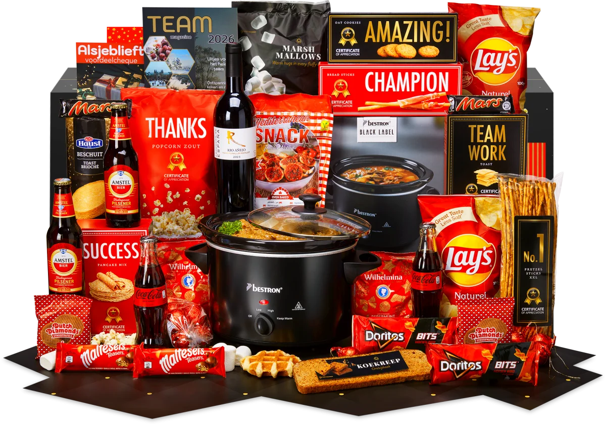 Naast de slowcooker bevat dit pakket onder andere Amazing Haverkoekjes 135 gram, Champion Broodstengels 125 gram en No. 1 Pretzels 200 gram, die zorgen voor een smakelijke aanvulling op uw feestmaaltijden. Ook inbegrepen zijn Teamwork Toast 100 gram en Success Pannenkoekenmix 180 gram, waarmee u eenvoudig een feestelijke brunch kunt organiseren.