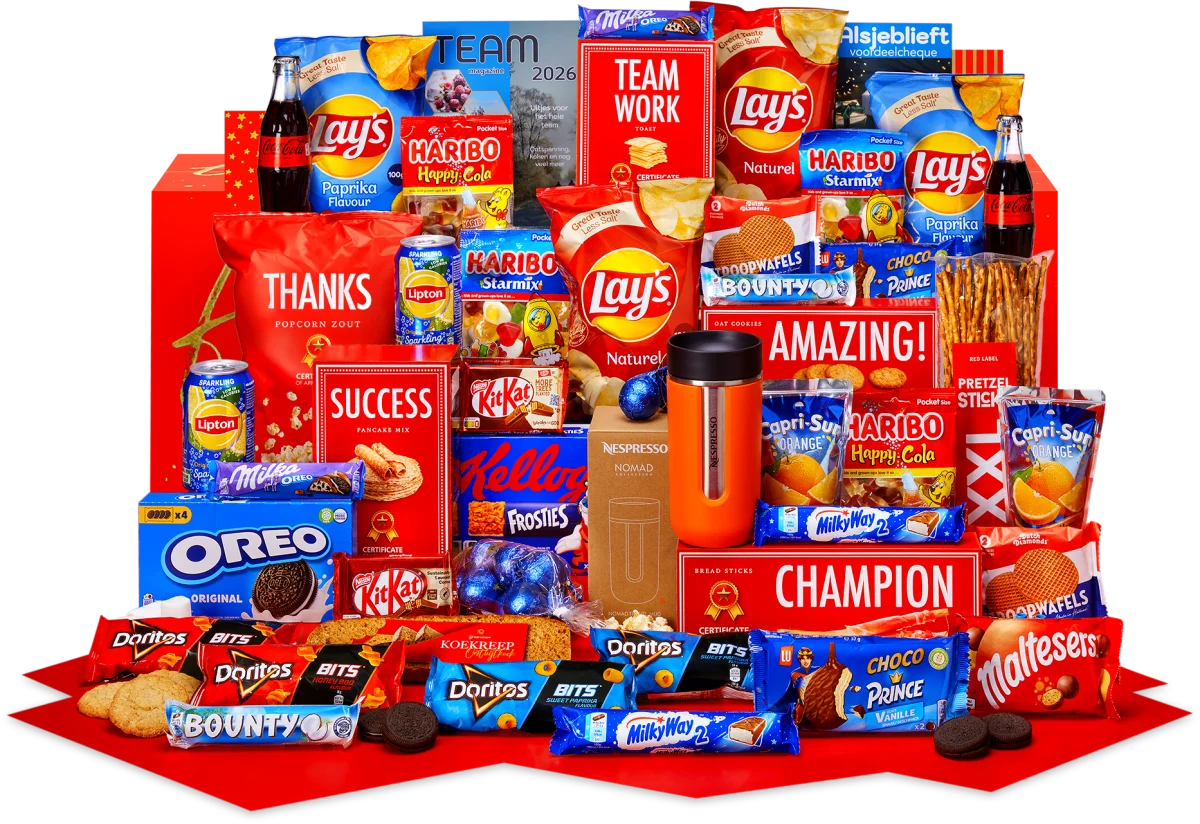 Het pakket bevat ook heerlijke snacks zoals No. 1 Pretzels 200 gram, Success Pannenkoekenmix 180 gram, en Popcorn 125 gram. Voor de zoetekauw zijn er lekkernijen zoals de Chocolade boomhanger 100 gram en Oreo Filled Cookie 176 gram Original.
