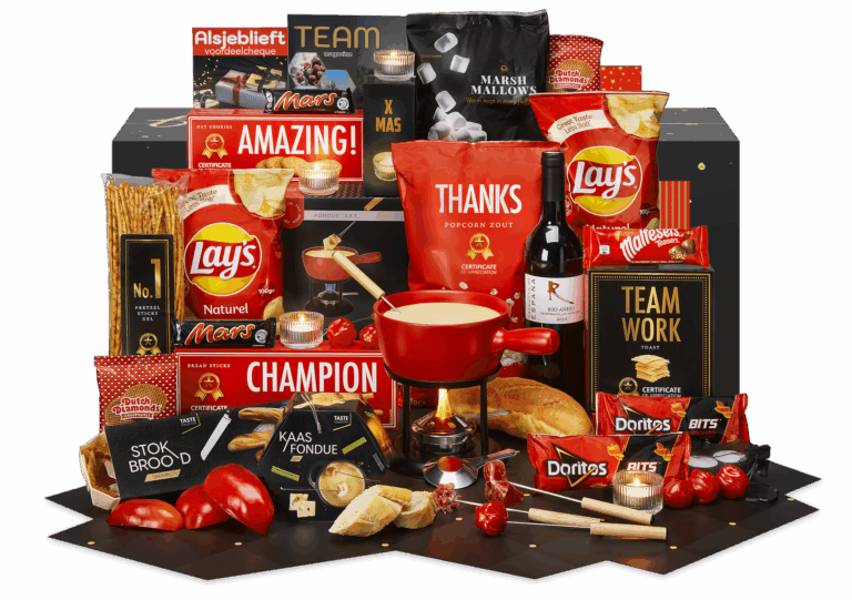 Als het buiten sneeuwt en de haard knispert, is er niets gezelliger dan een avondje fonduen. Het Fondue kerstpakket biedt alles voor een sfeervol samenzijn: een authentieke fondueset, sfeervolle kaarsjes, een fles rode wijn en natuurlijk heerlijke kaas.